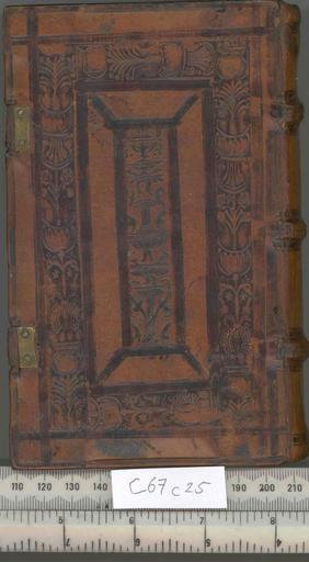 | Keywords: Krieg Buechlin des Friedes - Lower cover (c67c25).jpg Style Panel design; Caption Lower cover; Colour Brown; Edge Ink ms note exhibition history Decorative Technique Tooled in blind; Cover Material Calf Remnants of 2 pairs of clasps Ms title written on fore edge Macchi states; Bound 1550-1600 Simmern Palatine Germany bound by V S binder as the central panel stamp and surrounding Aldus fleurons suggest I Schunke Die Einbaende der Palatina p XXVI Simmern is located in the Palatinate Region in which several binders who used cyphers were to be found probably followers of this fashion spread out in Cologne The Vatican Library keeps a German Renaissance binding provided with the same panel stamp I Schunke Die Einbaende der Palatina p 45 p XXVI shelfmark Pal IV 507 The bow behind the cross is unusual object history Text 1550; Frankfurt; Unspecified object type Cc-zero place of creation Binding Germany place of discovery Unspecified British Library image http //www bl uk/catalogues/bookbindings/LargeImage aspx RecordId 020-000004450 ImageId ImageId 41830 Copyright BL Krieg Buechlin des Friedes Uploaded with GWToolset Krieg Buechlin des Friedes - Lower cover c67c25 http //www webarchive org uk/bldatasets/bindings/6383_4 jpg Bookbinding 16th-century bookbinding British Library Bookbindings |