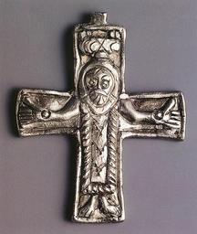 | Keywords: Kříž z Mikulčic.png cs Stříbrný závěsný křížek zobrazuje v reliéfu postavu Ukřižovaného oděného v dlouhé tunice s širokým lemováním Nad hlavou Krista je štítek snad s písmeny CCXO které mohou být nepochopenou původní symbolikou slunce a měsíce Maskovité zdůraznění hlavy s expresivním výrazem tváře je spojováno s iroskotským uměním oděv Krista a celkové pojetí křížku je naopak považováno za doklad východního nejspíše syrského původu Nelze vyloučit ani vlivy umění koptského Nejbližší analogií zůstává dvoustranný olověný křížek z bývalého kláštera sv Kláry v Mohuči Mikulčický křížek byl nalezen v sídlištní vrstvě 6 m jižně od baziliky a možná pochází z některého porušeného hrobu http //strelci scherm cz/utility/e1000/exponaty_pic/230_kriz jpg Creator Dragovit 2011-09-27 Cc-zero Great Moravia Great Moravia jewellery latin cross 9th-century works in the Czech Republic |