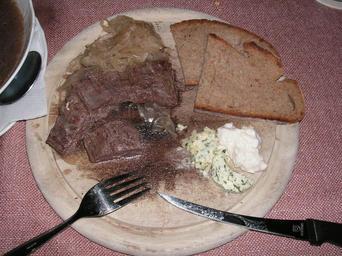 Keywords: Kronfleisch 6.jpg Kronfleisch skirt steak a traditional bavarian dish Served with onion rings rye bread composed butter with herbs and garlic and horseradish Own 2007-08-07 Alcibiades Rye bread Kronfleisch Horseradish