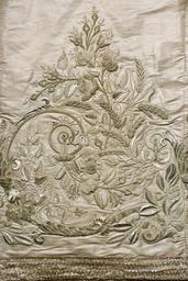 | Keywords: Kronprinsessan Lovisas brudklänning. Detalj av klänning - Livrustkammaren - 86109.tif Buren vid vigseln i Storkyrkan den 19 juni 1850 Brudklänning bestående av sammansytt liv och kjol samt släp Av silverinvävt siden med silverbroderi Liv H mitt fram 430 m mitt bak 290 mm midja 58 mmm<br/>Figursytt snörliv skuret av 8 stycken Livet går ner i en djup spets fram så gott som rakt avtaget i ryggen Insydda fjädrar Snöres i ryggen med silkeband Djup modetypisk ringning som går ut över axlarna Veckad bertakrage framtill Korta hovärmar vars gallerband är dekorerad med broderade bladslingor i silver Ärmarna är överklädda med tyll I vardera ärmen är ett tunt silverband -i klänningens tyg- fastsytt som bildar en långt nedhängande ögla Troligen enbart en dekorativ detalj ska kanske erinra om de kunliga damernas hängärmar som hörde till hovdräkten Kring midjelinjen är fyra små sydda öglor - två i ryggen och två framtill - för fasthakande av släpet Foder av vitt siden Kjol L mitt fram 1140 mm mitt bak 1240mm Sydd av sju våder Vådbredd 510 mm Baktill ett 320 mm långt sprund från midjan och nedåt Fodrad med vitt siden Dekor Broderad applicerad dekor i kraftig relief utförd i försilvrad koppartråd paljetter och lan i plattsöm och läggsöm Motivet utgörs av blommor och blad där bl a rosor och sädesax ingår Dekoren växer från kjolens nedredel upp mot klänningens mitt mitt fram Nertill kantas kjolen av en tunn spetsliknande genombruten silvergalon original caption Kronprinsessan Lovisas brudklänning Detalj av klänning LRK 19109<br/> Nyckelord Klänningstyg Detalj Broderad Lovisa Brudklänning Föremålsbild Vit Karl XV och Lovisa av Nederländernas bröllop 1850-06-19 silk d1 - dräkt - yttermaterial material siden - silver thread d7 - dräkt - dekor material silvertråd size mm 430 liv size mm 1140 kjol LRK Lovisa av Sverige drottning av Sverige 1828-1871 Haag Nederländerna Brudklänningar 1986-1987 Brödrafolkens väl 2005 Bröllop för kung och fosterland 2010-2011 Livrustkammaren place of origin original filename lm_dig6366-19109 53885 inventory number LRK 19109 86109 CC-BY-SA Matti Östling <gallery caption Different images of same object > File Kronprinsessan Lovisas brudklänning och släp - Livrustkammaren - 86108 tif File Kronprinsessan Lovisas brudklänning Detalj av klänning - Livrustkammaren - 86110 tif </gallery> Matti Östling Wedding dresses of royalty Fashion in 1850 Media contributed by LSH unmatched event Media contributed by LSH dim-with multiple size templates Media contributed by LSH unmatched keyword Embroidered clothing Color images from Livrustkammaren Court dress of Sweden Media contributed by LSH 2013-10 |