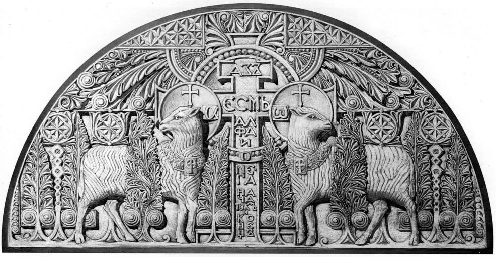 | Keywords: Kronstadt cathedral detail (1).jpg  Original draft artwork for the entrance portal of the Naval Cathedral in Kronstadt by Vasily and Georgy Kosyakov Inscription I am alpha and omega begining and end - Revelation 1 8 П оект  о ского собо а в К онштадте - ба ельеф над входным по талом Василий и Гео гий Косяковы Savelyev Yu R Vizantiysky stil v architecture Rossii Савельев Ю Р Византийский стиль в а хитекту е России - СПБ 2005 Saint Petersburg 2005 ISBN 5-87411-207-6 Published 1903 Vasily Kosyakov - lead architect 1862-1921 Georgy Kosyakov - interiors draftsmanship 1872-1925 PD Photo of actual stone bas relief Russian wikipedia ru File Lepnina_morskoi_sobor JPG PD-old-70 Kronstadt Naval Cathedral Reliefs of the Agnus Dei Alpha Omega |