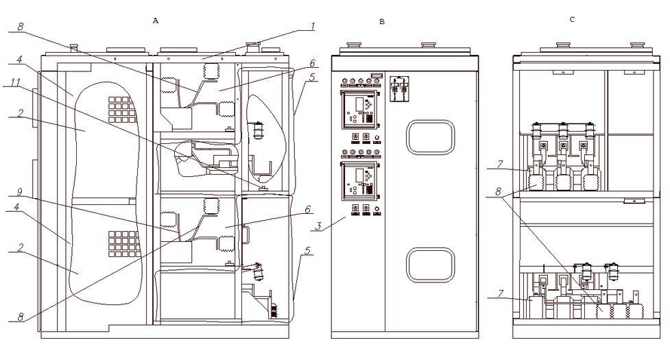 | Keywords: KRU 1.png  Эскиз ячейки КРУ A - вид сп ава B - вид спе еди С - вид сзади 1 - ко пус шкафа 2 - выкатной элемент в кассете 3 -  елейный отсек 4 - отсек выкатного элемента 5 - линейный отсек 6 - отсек сбо ных шин 7 - т ансфо мато ы тока 8 - шины 9 - опо ные изолято ы Own 2007-11-06 FearChild circuit Electrical schemas Medium-voltage switchgear |