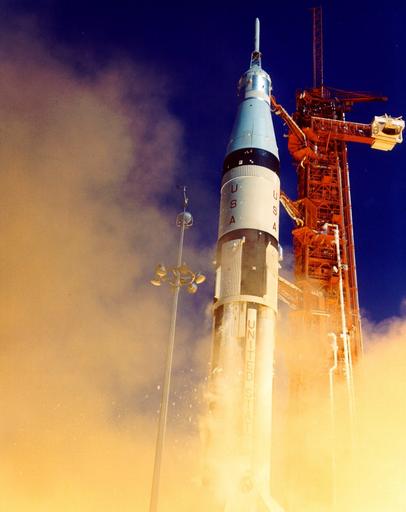 Keywords: Apollo 7 lifts off from Launch Complex 34. Date: October 11, 1968 (Credit: NASA/Kennedy Space Center) Apollo 7 lifts off from Launch Complex 34. Date: October 11, 1968 (Credit: NASA/Kennedy Space Center)