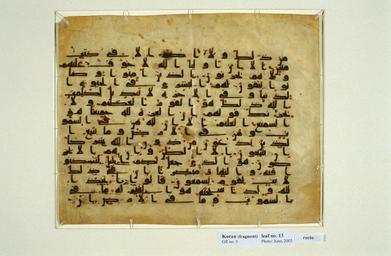 | Keywords: Kufi - D IV style.jpg en Verses 61-73 of the 10th chapter of the Qur'an entitled Surat Yunus Jonah The text's Kufi script appears related to the D IV style typical of horizontal Qur'ans produced on parchment during the 9th century LOC-calligraphy ascs 291 Unknown Calligrapher century 9 PD-Art Qur'an manuscripts 9th century Library of Congress Arabic Persian and Ottoman calligraphy collection Kufic style | ||||