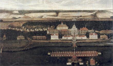 Keywords: Kuks h ikonografie01.jpg Zámek a lázně v Kuksu pohled od špitálu mezi lety 1720-1729 olej na plátně ze sbírek špitálu v Kuksu Kaše J Kotlík P Braunův Betlém Praha 1999 obr 13 1720-1729 author PD-old Hospital Kuks PD-old-100