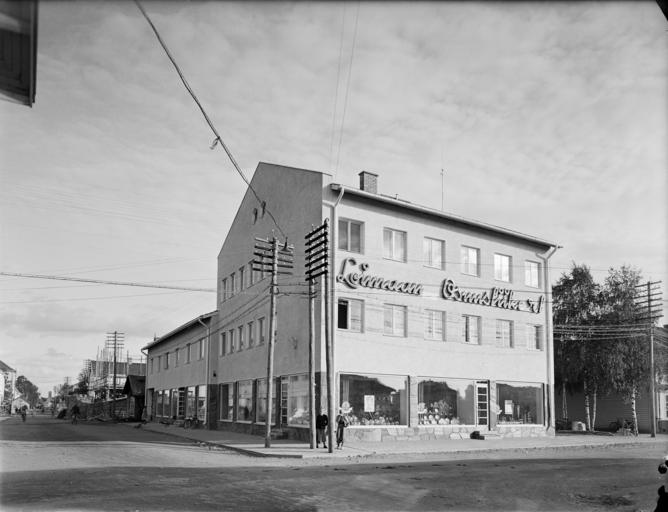 | Keywords: blackandwhite monochrome outdoor building architecture black and white Loimaan Osuusliikkeen keskustoimipaikka. Alkuperäinen kuvateksti: "Tällainen on Loimaan Osuusliikkeen uusi keskustoimipaikka, joka sijaitsee keskellä kauppalaa torin varrella ja pystyy varmasti pitkän aikaa säilyttämään asemansa paikkakunnan ajanmukaisinpana liiketalona." (Kuluttajain lehti 19/1950, s. 6) photographer unknown / kuvaaja tuntematon 1950 Loimaa, Varsinais-Suomi, Finland / Suomi Finnish Museum of Photography / Suomen valokuvataiteen museo Loimaan Osuusliikkeen keskustoimipaikka. Alkuperäinen kuvateksti: "Tällainen on Loimaan Osuusliikkeen uusi keskustoimipaikka, joka sijaitsee keskellä kauppalaa torin varrella ja pystyy varmasti pitkän aikaa säilyttämään asemansa paikkakunnan ajanmukaisinpana liiketalona." (Kuluttajain lehti 19/1950, s. 6) photographer unknown / kuvaaja tuntematon 1950 Loimaa, Varsinais-Suomi, Finland / Suomi Finnish Museum of Photography / Suomen valokuvataiteen museo |