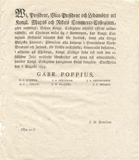 | Keywords: Kungörelse om kolerans utbrott 1833, bild 2.jpg  sv Kungörelse från Kungliga Majestät och Kommerskollegium i Stockholm den 6 augusti 1833 i samband med kolerans utbrott i Antwerpen en A public notice anno 6th august 1833 from the staff of the swedish king who shall introduce restrictions because of Cholera epidemic in Antwerpen ru Общественное уведомление anno 6-ого августа 1833 от штата шведского ко оля кото ый должен ввести ог аничения из-за эпидемии Холе ы в Антве пене de Eine Bekanntheit anno 6 erhabener 1833 vom Personal des schwedischen Königs der Beschränkungen wegen der Cholera-Epidemie in Antwerpen einführen soll PD-old 1833-08-06 Cholera 1833 in Sweden August 1833 in Europe |