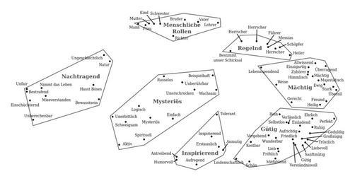 | Keywords: Kunkel God image concept map de.svg de Concept-Map von Gottesbildern nach Kark A Kunkel u a God Images A Concept Map Journal for the Scientific Study of Religion 38 2 1999 193 “202 Die Teilnehmer der Studie Studenten einer sĂĽdwestamerikanischen Universität wurden augefordert maximal drei Worte auf die offene Frage What is God Like aufzuschreiben Eine unabhängige Gruppe identifizierte darin 85 einzelne Worte die die gesamte Bandbreite der Antworten umfassten AnschlieĂźend wurden die Teilnehmer aufgefordert die 85 Worte ohne weitere Einschränkungen nach Ă„hnlichkeit zu sortieren Daraus wurde mit Hilfe multidimensionaler Skalierung dieser zweidimensionale Datensatz erstellt; die Nähe zwischen einzelnen Punkten entspricht der Häufigkeit mit der die Worte von den Teilnehmern ähnlich sortiert wurden own MagenspĂĽlung SVG diagrams in German Diagrams of Christianity Image of God Concept maps |