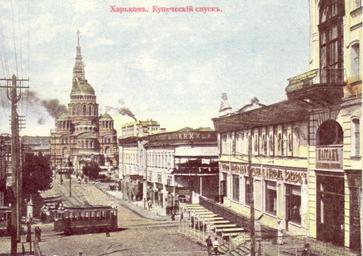 | Keywords: Kupechesky spusk.jpg View from Kupechesky Spusk towards Kupechesky Bridge Blagoveshchenskaya Square and Annunciation Cathedral ru Вид с Купеческого спуска в сто ону Купеческого моста Благовещенской площади и Благовещенского собо а A reproduction of post cards dated early 20th century own scan for original paper postcard // еп одукция почтовой ка точки начала XX века свой скан бумажной отк ытки 1910th\Early 20th century Unknown; на отк ытке не указан PD-old PD-RusEmpire Postcards of Kharkiv Trams in Kharkiv Blagoveschensky Cathedral in Kharkiv Sobornyi Descent Kupechesky Bridge Historical trams in Ukraine |
