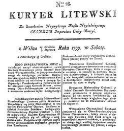 Keywords: Kurier Litewski 1799 n 28 - newspaper.jpg en first page of newspaper Kuryer Litewski 28 1799 AD Russian empire ru пе вая ст аница газеты Kuryer Litewski 28 1799 г на польском языке be пе шая ста онка газеты Kuryer Litewski 28 1799 г на польскай мове newspaper Kuryer Litewski 28 1799 AD Russian empire page 1 own work 2013 free public domain Газеты на польскай мове Газеты Рэчы Паспалітай Газеты Расійскай імпе ыі Газеты Бела усі Газеты Літвы Cc-zero Uncategorized 2013 January 24