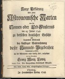 | Keywords: Kurze Erklärung über zwei astronomische Karten von der Sonnen.jpeg en The title page of the book Kurze Erklärung über zwei astronomische Karten von der Sonnen Nürnberg 1748 ru Титульная ст аница книги Kurze Erklärung über zwei astronomische Karten von der Sonnen ю нбе г 1748 National Library of Australia http //nla gov au/nla map-rm3669-s1-e author 1748 PD-old-100 Title pages from Germany 1748 books Georg Moritz Lowitz | ||||