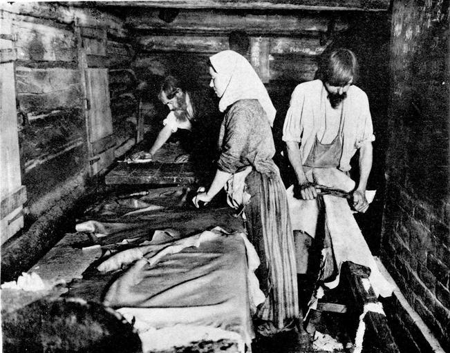 | Keywords: Kustari 089 Otdelka belogo opojka.jpg en Handicraft Industry and Trades of Nizhegorodskaja gubernija Katunki XIX c Куста ные п омыслы и емёсла ижего одской губе нии Отделка белого опойка Село Катунки Балахнинского уезда 1896 год Tannage de peaux de veau menues Village de Katounki du district de Balachna Скани ован из книги ижего одская губе ния по исследованиям губе нского земства Выпуск II Куста ные п омыслы ижего одской губе нии / сост А Плотников СПб 1896 еизвестный фотог аф конца XIX века Типо-лит и фототипия П И Бабкина в Санкт-Пете бу ге 1896 PD-old thumb Handicraft Industry of Nizhny Novgorod province Tanners Skinners Black and white photographs of people at work Leather working tools |