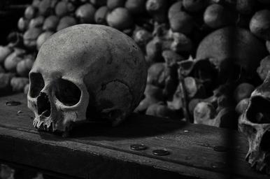 Keywords: kutna hora ossuary bones skulls hora skeleton human death czech republic cemetery christianity religion old crypt wall jaw eye-socket face catholic