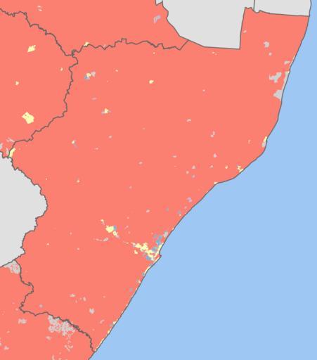 | Keywords: KwaZulu-Natal 2001 dominant population group map.svg  fb8072 Black African 8dd3c7 Coloured 80b1d3 Indian or Asian ffffb3 White bebada No group dominant d0d0d0 No population Projection is Albers Equal-Area Conic with standard parallels at 25 5° S and 31 5° S and origin at 28 5° S 25 5° E Statistics South Africa's Census 2001 is the source of the basic population data The map results from my own processing of the data Htonl 2010-02-15 Htonl The following license applies to the population data on which the map is based http //www statssa gov za/copyrightdisclaimer asp the user acknowledges Stats SA as the source of the basic data wherever they process apply utilise publish or distribute the data and also that they specify that the relevant application and analysis where applicable result from their own processing of the data The following tag applies to the map itself Demographic maps of South Africa Maps of KwaZulu-Natal Maps with Albers projection |