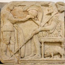 | Keywords: Kybernis north BM B287.jpg A young warrior wearing a corslet over a short tunic supports a shield with his left hand and receives or hands over a crested helmet from a seated bearded figure wearing tunic and cloak and supporting a long staff A bear or dog stands beneath the throne Central panel from the north side of Kybernis' tomb acropolis of Xanthos in Lycia ca 480 BC Un jeune guerrier portant une cuirasse sur une tunique courte tient de la main gauche un bouclier et de l'autre reçoit ou donne un casque à cimier de la part d'un personnage barbu et assis portant tunique et manteau et muni d'un long bâton Sous le trône un ours ou un chien Panneau central du côté nord de la tombe de Kybernis sur l'Acropole de Xanthos vers 480 av J -C H 1 02 m 40 in W 2 3 m 90 ½ in Museum British Museum Main floor room 15 Greek Rome object history credit line From the French excavations on the Acropolis of Xanthos accession number GR 1848 10-20 1 Cat Sculpture B 287 Jastrow 2006 other versions <gallery> Image Kybernis north BM B287 n2 jpg Image Kybernis west BM B287 jpg </gallery> 480s BC Xanthos Classical Greek sculptures Ancient Greek reliefs in the British Museum Relief panels from the Harpy Tomb Ancient Greek warriors |