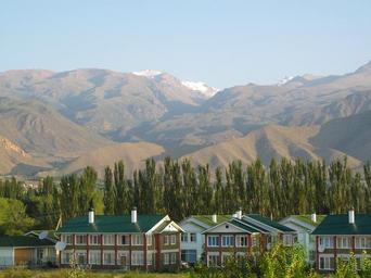 Keywords: kyrgyz republic landscape mountains sky clouds apartments architecture buildings valley trees outside country countryside summer spring