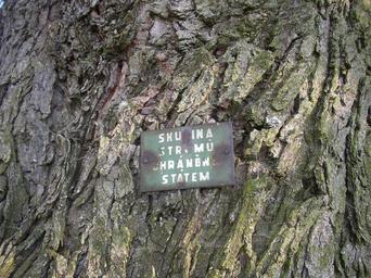 | Keywords: Kysice KL CZ Javory v Kysicich Acer saccharinum 078.jpg Javory v Kyšicích skupina tří památných javorů stříbrných Acer saccharinum v obci Kyšice okres Kladno Javory rostou při jižním okraji obce na severozápadním břehu rybníka Parkán Západní strom detail kmene - štítek označující chráněné stromy SKUPINA STROMŮ CHRÁNĚNÁ STÁTEM Javory v Kyšicích Maples in Kyšice protected group of three Silver Maples Acer saccharimum in village of Kyšice Kladno District Central Bohemian Region Czech Republic Official plaque on trunk of the western specimen STATE-PROTECTED TREE GROUP This marking directly on the tree was the standard way in the 1980s Javory v Kyšicích Memorable tree signs in the Czech Republic Acer saccharinum bark |