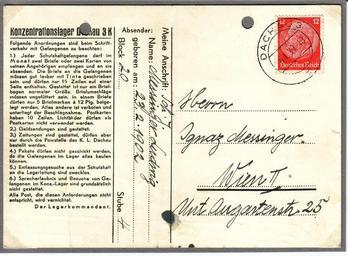 | Keywords: KZ Dachau-Reichspogromnacht.jpg Postkarte eines Häftlings aus dem de KZ Dachau vom Januar 1939 Poststempel Dachau 3 vom 6 1 1939 Postcard from a prisoner at en Dachau concentration camp postmarked January 1 1939 from Dachau 3 The text on the left of the card contains the rules for correspondence with a prisoner Each prisoner was allowed two letters or cards a month Letters had to be legible in ink 15 lines and only one page The paper had to be a normal size Envelopes could not be lined with paper Stamps could be sent a maximum of five at 12 pfennigs each Postcards were restricted to 10 lines no pictures allowed Money could be sent Newspapers could be sent but only through the Dachau post office Packages were not allowed since the prisoners can buy everything at the camp Number 5 states Requests to the camp command for release from protective custody are futile Number 6 states that permission to speak with or visit prisoners is categorically forbidden The final sentence advises that all mail that does not adhere to the rules will be destroyed Private Sammlung 2007-08-16 <br/> original text 1 Scanned 2007-08-16 Scanned von Radzuweit PD-old - Stamp is covered by en de minimis KZ Dachaukarte JPG PD-Germany-§134-KUG original upload log de wikipedia Feloidea page de wikipedia KZ_Dachau-Reichspogromnacht jpg 2007-08-16 16 35 Radzuweit 1800×1324× 444394 bytes <nowiki> Information Postkarte eines Häftlings aus dem KZ Dachau vom Januar 1939 Poststempel Dachau 3 vom 6 1 1939 Private Sammlung Scanned von Radzuweit Scanned 2007-</nowiki> Dachau concentration camp documents 1932 stamps of Germany |