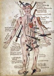 | Keywords: drawing text sketch L0022470 Pseudo-Galen, Anathomia; WMS 290 Credit: Wellcome Library, London. Wellcome Images images@wellcome.ac.uk wellcomeimages.org 'Wound man' : flesh tinted: weapons coloured. mid 15th century Anathomia, (English) Claudius (Pseudo) Galen Published: - Copyrighted work available under Creative Commons Attribution only licence CC BY 4.0 creativecommons.org/licenses/by/4.0/ L0022470 Pseudo-Galen, Anathomia; WMS 290 Credit: Wellcome Library, London. Wellcome Images images@wellcome.ac.uk wellcomeimages.org 'Wound man' : flesh tinted: weapons coloured. mid 15th century Anathomia, (English) Claudius (Pseudo) Galen Published: - Copyrighted work available under Creative Commons Attribution only licence CC BY 4.0 creativecommons.org/licenses/by/4.0/ |