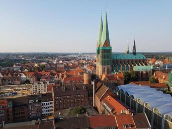 Keywords: lübeck city view steeple st mary's church view house of worship town center bird's eye view city overview from above