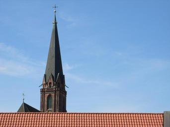 Keywords: lüneburg roofs church building spire nicolai church sun blue steeple sky