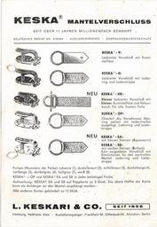 | Keywords: L. Keskari CO Keska-Pelz-Verschluss, Karte.tif Pelz-Klipverschluss der Firma C Keskari der žKeska 1952 wurde er erstmals auf der Pelzmesse in Frankfurt am Main angeboten Der Begriff Keska ist noch heute 2011 in der deutschen Pelzbranche als ein Allgemeinbegriff für einen Pelzklipverschluss gebräuchlich Keska Mantelverschluss seit über 11 Jahren millionenfach bewährt Fur coat fastener Own family own design ca 1963 Firma Keskari PD-heirs <gallery>File L Keskari CO Keska-Pelz-Verschluss Modell OP jpg</gallery> Keskari fur traders Furriers technology Snap fasteners |