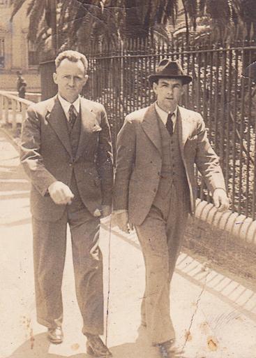 Keywords: guy lynch guylynch frank lynch franklynch joe lynch joelynch rupert ingleby rupertingleby (L) "Guy" Frank Lynch - (R) Rupert Ingleby c 1940 Frank “Guy” Lynch 1895-1967 This photograph c 1940 [L] Guy Lynch [R] Rupert Ingleby was possibly taken in Sydney. In those days it was common for professional ‘street photographers’ to offer their photographic services on the streets in major cities. My grandfather Bernard Ingleby 1878-1941 was an Advertising writer and part time poet who published 42 poems, most in The Bulletin and one in The Lone Hand, between 1904 to 1928. As a result he had close ties with the artistic people of the period 1910 to 1940 in Melbourne and Sydney, including sculptor - Guy Lynch, Artist - Unk White, Poets - Henry Lawson, Victor James Daly, John Keith McDougal and Garry Lyle. Artists – Percy Lindsay (best man at Bernards’ 1905 wedding in Melbourne, although family legend apparently wrongly claimed that Henry Lawson was the best man], Walter Hobbs, Edgar James Turner and Jack Sommers [artist & poet]. My parents Rupert & Una Ingleby were close friends of Guy Lynch and Unk White, initial contact most likely as a result of Bernard’s connection with The Bulletin and his socialising with the many artists and poets who had their work published in it. As a 19 year old, in 1897-1898 Bernard was an ‘observer’ in Clement Wragge’s meteorological observatory, first an arctic tent, then a hut on the summit of Mount Kosciuszko. Guy was born in Melbourne, Victoria and the family moved to Auckland, New Zealand and in 1915, he fought at Gallipoli and in France. He moved to Australia in 1922 with his brother Joe Lynch, a cartoonist. Joe and Unk White used to sketch people on the streets of Auckland. In 1929 Guy studied in London at the Royal College of Arts. His sculptures include: 1931 a bust of writer Beverley Nichols, 1938 a bust of Sir Isaac Isaacs, Paris - a bust of Lieutenant General Baron Birdwood - before returning to Sydney in 1938. The war memorial in Devonport, NZ has a statue of the ‘untidy soldier.’ Other works include “Australian Venus,” and “The Digger” he made a bust of Dame Nellie Melba’s grand-daughter Pamela and a garden sculpture “Victory of Orpheus.” He later created the figures for the battle diorama ‘Pozieres’ at the Australian War Memorial, Canberra. The three (3) large doors fitted to the Mitchell wing of the SLNSW, have 18 panels incorporated into each of the doors. The left door is of Aboriginal heritage, the middle door is of Explorers and the right door is Aboriginal heritage. The panel Guy created is on the right door and is titled, ‘Carrying the euro – Luritja Tribe.’ In 1924 he created The Satyr - being a large plaster sculpture held at the Art Gallery of NSW for which his brother Joe was the model. It was displayed at the Art gallery in 1989 in an exhibition titled, ”Stampede of the lower gods.” In 1927, Joe fell off a ferry in Sydney harbour and drowned. Joe had been on his way to a bohemian party at the Mosman home of George & Natalie Finey with a group of artists. (Ref: Poetry of Place, Royal Botanic Gardens, Sydney by Edwin Wilson) In 1977 Guy’s wife Madge had a smaller bronze cast made from The Satyr and it was erected in the Royal Botanic Gardens near the gates, directly behind the Sydney Opera House, where it looks out onto the harbour to the spot where Joe drowned. Poet, Kenneth Slessor wrote an emotive poem titled ‘Five Bells’ about Joe’s drowning. Ref: adb.anu.edu.au/biography/lynch-francis-ennis-guy-10878 and mjedmo.wordpress.com/2012/02/22/talking-about-joe-lynch/ (L) "Guy" Frank Lynch - (R) Rupert Ingleby c 1940 Frank “Guy” Lynch 1895-1967 This photograph c 1940 [L] Guy Lynch [R] Rupert Ingleby was possibly taken in Sydney. In those days it was common for professional ‘street photographers’ to offer their photographic services on the streets in major cities. My grandfather Bernard Ingleby 1878-1941 was an Advertising writer and part time poet who published 42 poems, most in The Bulletin and one in The Lone Hand, between 1904 to 1928. As a result he had close ties with the artistic people of the period 1910 to 1940 in Melbourne and Sydney, including sculptor - Guy Lynch, Artist - Unk White, Poets - Henry Lawson, Victor James Daly, John Keith McDougal and Garry Lyle. Artists – Percy Lindsay (best man at Bernards’ 1905 wedding in Melbourne, although family legend apparently wrongly claimed that Henry Lawson was the best man], Walter Hobbs, Edgar James Turner and Jack Sommers [artist & poet]. My parents Rupert & Una Ingleby were close friends of Guy Lynch and Unk White, initial contact most likely as a result of Bernard’s connection with The Bulletin and his socialising with the many artists and poets who had their work published in it. As a 19 year old, in 1897-1898 Bernard was an ‘observer’ in Clement Wragge’s meteorological observatory, first an arctic tent, then a hut on the summit of Mount Kosciuszko. Guy was born in Melbourne, Victoria and the family moved to Auckland, New Zealand and in 1915, he fought at Gallipoli and in France. He moved to Australia in 1922 with his brother Joe Lynch, a cartoonist. Joe and Unk White used to sketch people on the streets of Auckland. In 1929 Guy studied in London at the Royal College of Arts. His sculptures include: 1931 a bust of writer Beverley Nichols, 1938 a bust of Sir Isaac Isaacs, Paris - a bust of Lieutenant General Baron Birdwood - before returning to Sydney in 1938. The war memorial in Devonport, NZ has a statue of the ‘untidy soldier.’ Other works include “Australian Venus,” and “The Digger” he made a bust of Dame Nellie Melba’s grand-daughter Pamela and a garden sculpture “Victory of Orpheus.” He later created the figures for the battle diorama ‘Pozieres’ at the Australian War Memorial, Canberra. The three (3) large doors fitted to the Mitchell wing of the SLNSW, have 18 panels incorp