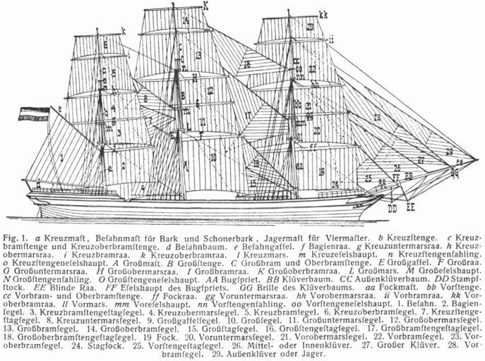 Keywords: L-sail.png Lueger Lueger/Seafaring Names of sails on square riggers Names of parts of rig or sails Drawings of ships Legend in German
