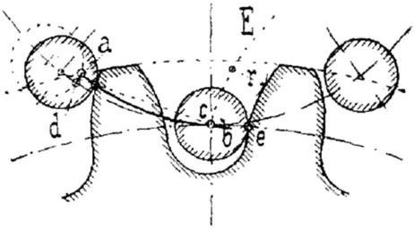 | Keywords: L-Triebstockverzahnung.png Triebstockverzahnung enthält an dem einen Rade axial stehende runde Stifte als Zähne Wegen der Einfachheit der Herstellung ist diese Verzahnung sehr früh schon benutzt worden z B zum Antrieb der Mühlspindeln mit der sogenannten Laterne dem kleinen aus zwei Scheiben und den Stiften bestehenden Rade von der Wasserradwelle aus mit Pflöcken die seitlich an einem größeren Kranze vorstehen Dasselbe Getriebe Kronradgetriebe findet sich vielfach in größeren Uhrwerken Ferner bildet man Zahnstangen mit Triebstöcken leiterförmig aus Sonst wird diese Verzahnung nur seiten benutzt “ Erweitert man den im Teilkreise liegenden Punkt c s die Figur der Punktverzahnung Bd 7 S 297 zu einem Kreise vom Durchmesser 2 r gleich der Zahnstärke so hat man zu der Epicykloide E welche den Kopf des Gegenzahnes bildete eine Aequidistante im Abstande r nach innen zu legen um die zum Triebstock passende Kopfform zu erhalten Diese geht theoretisch von dem Punkte e welcher in der den Teilkreis in c berührenden Tangente liegt erst ein kleines Stück nach unten dann scharf umkehrend aufwärts Der absteigende Zweig der bis innerhalb des Teilkreises reicht liegt frei in der Zahnlücke Der Eingriff beginnt daher eigentlich erst zwischen e und c bei b im tiefsten Punkte der Kurve a c e Zeichnet man den Triebstock mehrmals auf dem Teilkreise etwas versetzt auf so ist jedesmal der dem Punkte c am nächsten liegende Punkt der Triebstockkreise ein Punkt der Eingrifflinie; danach ist ab die Eingriffstrecke a d das sehr kurze arbeitende Stück des Umfanges d b der Eingriffbogen welcher > t sein muß wonach die Kopfhöhe k des eingreifenden Rades zu bestimmen ist Die y Fußkurve kann ein die Lücke ausfüllender Halbkreis sein Lindner Lexikon Triebstockverzahnung Lueger Lexikon der gesamten Technik S 38813 vgl Lueger Bd 8 S 619 ff Lueger Lueger/Machine elements Drawings of gears and gearboxes Gear tooth design |