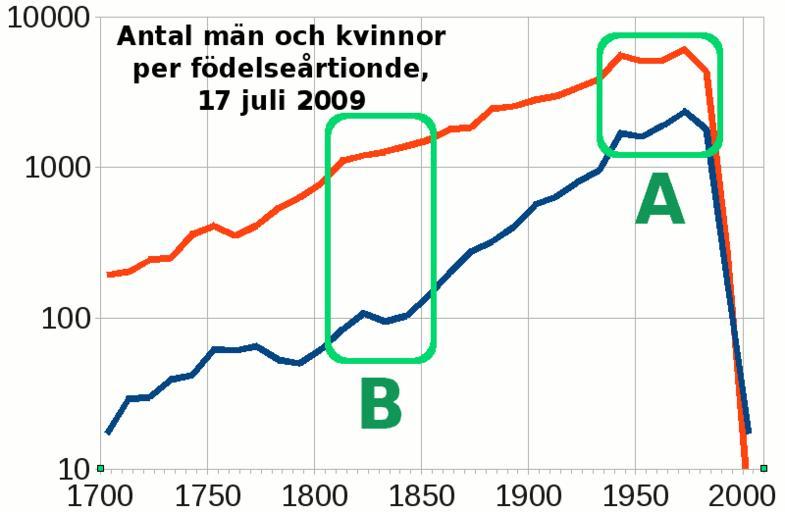 | Keywords: LA2-gender-age.png en Statistics about the Swedish Wikipedia as of July 17 2009 Distribution of biographic articles by gender and age decade of birth Vertical scale is logarithmic Living people A are 1 woman blue for every 3 men red for the more recent decades even 1 2 But for early 19th century B the ratio is worse than 1 10 sv Statistik om svenskspråkiga Wikipedia den 17 juli 2009 Fördelning av biografiska artiklar efter kön och ålder födelseårtionde Den vertikala axeln är logaritmisk Levande personer A är 1 kvinna blå per 3 män röd för de senaste årtiondena rent av 1 2 Men för början av 1800-talet B är förhållandet värre än 1 10 own LA2 2009-07-17 More recent statistics in File LA2-gender-age-2013 png graph Swedish Wikipedia statistics Location not applicable Persondata at Wikipedia |