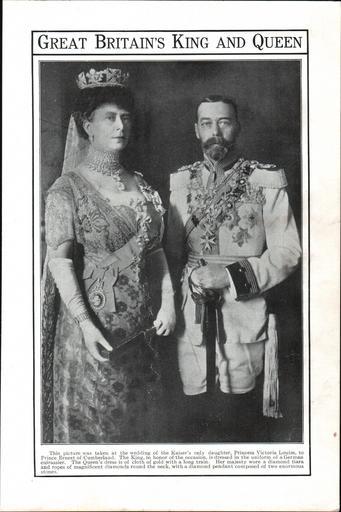 Keywords: LA2-NSRW-2-0139.jpg Great Britain's King and Queen This picture was taken at the wedding of the Kaiser's only daughter Princess Victoria Louise to Prince Ernest of Cumberland The King in honor of the occasion is dressed in the uniform of a German cuirassier The Queen's dress is of cloth of gold with a long train Her majesty wore a diamond tiara and ropes of magnificent diamonds round the neck with diamond pendant composed of two enormous stones Note the wedding was on May 24 1913 Image Great Britain's King and Queen 1913 jpg NSRW original see below LA2-NSRW Military uniforms of Germany Fashion in 1913 George V of the United Kingdom
