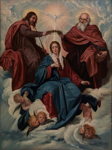 | Keywords: La Coronación de la Virgen (Museo del Prado).jpg  La obra representa la coronación de la Virgen María por los tres miembros de la Santísima Trinidad y es una copia del cuadro homónimo de Diego Velázquez que también se conserva en el Museo del Prado Siglo XVIII o XIX oil on canvas Size cm 126 167 Institution Museo del Prado Depositado en el Convento de San Pascual de Madrid https //www museodelprado es/coleccion/obra-de-arte/la-coronacion-de-la-virgen/4b99fb73-1e6e-4119-82d4-8317a7de32a7 accession number P03527 https //content cdnprado net/imagenes/Documentos/imgsem/4b/4b99/4b99fb73-1e6e-4119-82d4-8317a7de32a7/1fb0ac31-0a30-4dc8-840a-a6730e0088fb jpg PD-old-100 Paintings of the Coronation of Mary in Spain 18th-century paintings of Coronation of Mary 19th-century paintings of Coronation of Mary Paintings after Diego Velázquez Spanish 18th-century paintings in the Museo del Prado Spanish 19th-century paintings in the Museo del Prado Coronation of the Virgin Velázquez Iglesia y Convento de San Pascual Madrid |