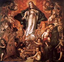 | Keywords: La Virgen de los Plateros, de Juan de Valdés Leal (Museo de Bellas Artes de Córdoba).jpg La obra representa a la Inmaculada Concepción acompañada por San Eloy el patrón de los orfebres y por San Antonio de Padua que lleva en brazos al Niño Jesús 1654 1656 oil on canvas Size cm 222 220 Institution Museo de Bellas Artes Córdoba accession number CE2121P place of creation place of discovery object history exhibition history credit line http //ceres mcu es/pages/Main http //3 bp blogspot com/-MVf_pn17ohc/TtlTihQpYeI/AAAAAAAAEMQ/sZj6nDtCdjg/s1600/Virgen+de+los+plateros jpg PD-old-100 Q21190346 Paintings of Immaculata in Spain 17th-century paintings of Immaculata Paintings of Saint Anthony of Padua in Spain 17th-century paintings of Saint Anthony of Padua Paintings of Saint Eligius Paintings of Virgin Mary by Juan de Valdés Leal Paintings of Christian saints by Juan de Valdés Leal Religious paintings in the Museum of Fine Arts of Córdoba 17th-century paintings in the Museum of Fine Arts of Córdoba |