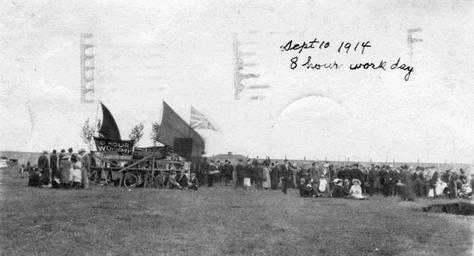 | Keywords: labour labour history labourhistory protesters protest labour demonstration labourdemonstration ontario canada history blackandwhite monochrome outdoor black and white Date: September 10, 1914 Description: The men and women in this photo are gathered together in support of the eight hour work movement. The movement advocated restricting the length of the work day so that workers would be able to balance work, rest, and leisure activities (such as time with family or attending church). Demonstrations such as this one were a critical component of Canada's labour union movement in the early 20th century. Accession No.: 974.2.97 Date: September 10, 1914 Description: The men and women in this photo are gathered together in support of the eight hour work movement. The movement advocated restricting the length of the work day so that workers would be able to balance work, rest, and leisure activities (such as time with family or attending church). Demonstrations such as this one were a critical component of Canada's labour union movement in the early 20th century. Accession No.: 974.2.97 |