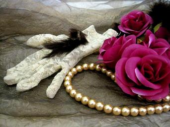 Keywords: lace glove white feather soft immatation roses pink immatation pearls string shiny arrangement