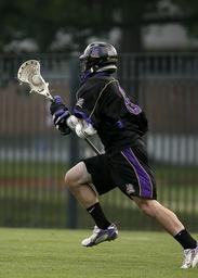 Keywords: lacrosse lax player sport stick competition field game athlete helmet action net ball teenager outdoors green grass fence park teen young youth running high school uniform american