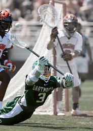 Keywords: lacrosse lax shot shooting sport stick equipment competition field game team athlete helmet action net uniform ball playing male competitive effort goalie goalkeeper angle outdoors college