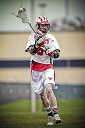 Keywords: lacrosse player stick ball action helmet sport playing male game gloves high school texas texan red confident determination sportsman athlete competition