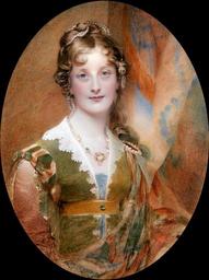 | Keywords: Lady Ellenborough (Ross).jpg Artwork Creator William Charles Ross Jane Digby Lady Ellenborough 1807-1881 seated before an aperture and hanging drapery wearing India green dress with amber and green shoulder rolls her jewelled sleeves slashed to reveal amber her neckline edged with white lace teal underdress a burnt orange teal and sea green stole pinned at her left shoulder with a pearl brooch saffron jewelled sash sapphire and emerald pendant necklace her blonde hair partially curled and upswept dressed with strands of pearls century 19 Size cm 16 4 unknown object history credit line accession number http //www bonhams com/auctions/19943/lot/116/ Bonhams London 21 Nov 2012 lot 116 PD-old-100 William Charles Ross 19th-century portrait paintings location missing Jane Digby 18th-century portrait paintings not categorised by year F 19th-century oval portrait paintings of women at half length Images from Bonhams |