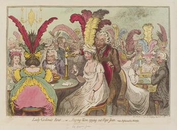 | Keywords: Lady Godina's rout; - or - Peeping-Tom spying out Pope-Joan by James Gillray.jpg Lady Godina's rout; - or - Peeping-Tom spying out Pope-Joan by James Gillray died 1815 published 1796 See source website for additional information According to the National Portrait Gallery of the UK the caricature refers to Lady Georgiana Gordon 1781 “1853 Duchess of Bedford from 1803 until her death; the title and the lecherous servant refer to Lady Godiva Pope-Joan is a card game; Lady Godina is holding the diamond nine which is called the Pope in that game The man sitting on Lady Godina 's right is John Sneyd 1763 “1835 ; the fat woman sitting on her left is Albinia Countess of Buckinghamshire died 1816 The fashion of women wearing vertical feathers or plumes in their head-dresses is abundantly satirized This set of images was gathered by User Dcoetzee from the National Portrait Gallery London website using a special tool All images in this batch have been confirmed as author died before 1939 according to the official death date listed by the NPG D12561 1796 James Gillray died 1815 File Lady-Godinas-Route-Gillray jpeg PD-old-100 1796 cartoons National Portrait Gallery London James Gillray Peeping Tom character caricatures of fashion |