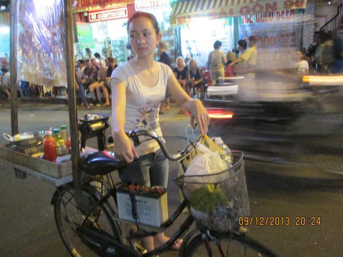Keywords: Lady selling eatables from a cycle in Bui Vien street..JPG en Cycle used as a mode of transport as well as a means of a portable snack restaurant own Rudolph A Furtado Monday 9-12-2013 Commerce in Ho Chi Minh City Cc-zero