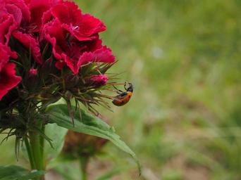 Keywords: ladybug coccinellidae beetle elytron siebenpunkt ladybird siebenpunkt coccinella septempunctata carnation flower blossom bloom red domed crawl krabbeltier spring