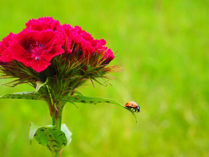 Keywords: ladybug coccinellidae beetle elytron siebenpunkt ladybird siebenpunkt coccinella septempunctata carnation flower blossom bloom red domed crawl krabbeltier spring