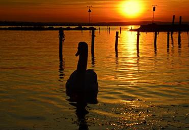 Keywords: lake balaton in the evening swan dusk sunset light gold sky