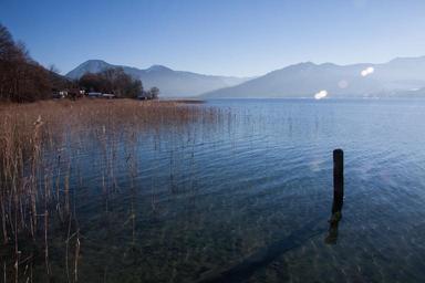 Keywords: lake clear wood pile mountains panorama bank sky water blue rest sunny landscape nature web boardwalk winter wintry haze reed phragmites australis grass poaceae marsh plant bluegrass