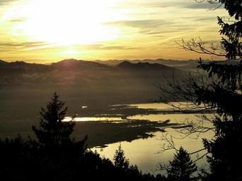Keywords: lake constance bregenz sunset tree mountains forest branches yellow cloud sun haze