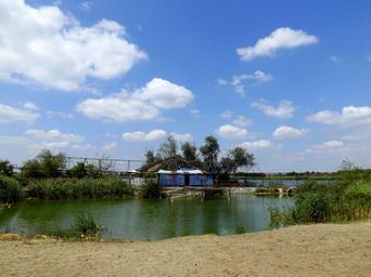 Keywords: lake cottage cloud beach sand reflection water blue landscape