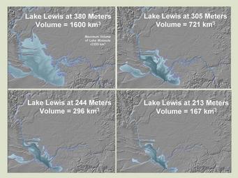 | Keywords: Lake Lewis flood profiles.jpg Upload is a series of profiles for the Lake Lewis level reached for various flood sizes w Lake Lewis was a temporary lake in the Pacific Northwest region of North America largely formed by the Missoula Floods in about the 14th millennium B C Lake Lewis was formed when the restricted flow of waters<ref>Flow was restricted by a hydraulic dam ”a restriction to the flow rate caused by a narrowed reach in a river valley </ref> from periodic cataclysmic floods from w Glacial Lake Missoula pluvial Lake Bonneville and perhaps from subglacial outbursts backed up through the constriction formed by the Wallula Gap in the Horse Heaven Hills southern Washington Water also backed up further downstream on the Columbia River between Washington and Oregon delaying the drainage of Lake Lewis The water remained for a period of weeks before the flood waters drained through Wallula Gap just southeast of the Tri-Cities area Lake Lewis reached an elevation of about 1200 above sea level today's sea level before subsiding Citation Last George V Bruce N Bjornstad and Byron M Gessel 2009 Distribution of Mammoth Mammuthus and Erratic Finds Relative to the Size of Ice Age Floods in Southeastern Washington State Pacific Northwest National Laboratory PNNL-SA-68903 Last Published by the U S Department of Energy's Pacific Northwest National Laboratory - confirmed with their legal department that reproductin publication on Wikipedia is acceptable if cited PD-USGov Palaeomaps Glacial outburst floods Lake Lewis Touchet Formation Ice age |