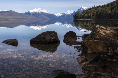 Keywords: lake mcdonald rocks reflection landscape panorama scenic park mountain range peaceful water outdoors national park glacier montana usa