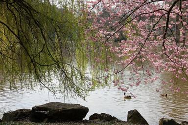 Keywords: lake pond water spring bank tree trees blossom blossom bloom stones